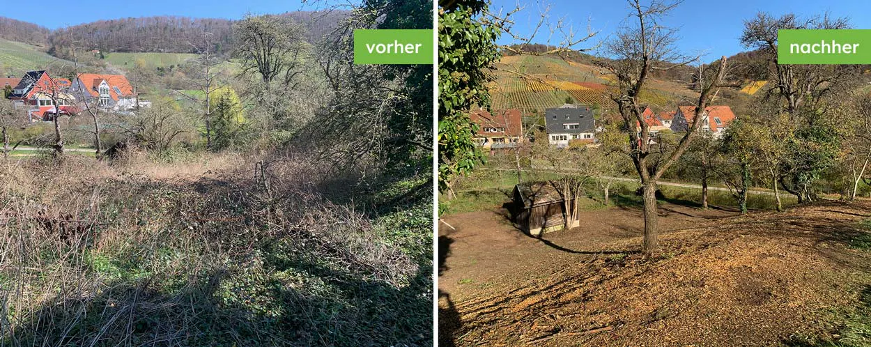 Fachgerechte Rodung von verwilderten Streuobstwiesen, Brachflächen und Strauchbewuchs mit anschließender Aufbereitung der Flächen für neue Nutzung oder naturnahe Entwicklung.